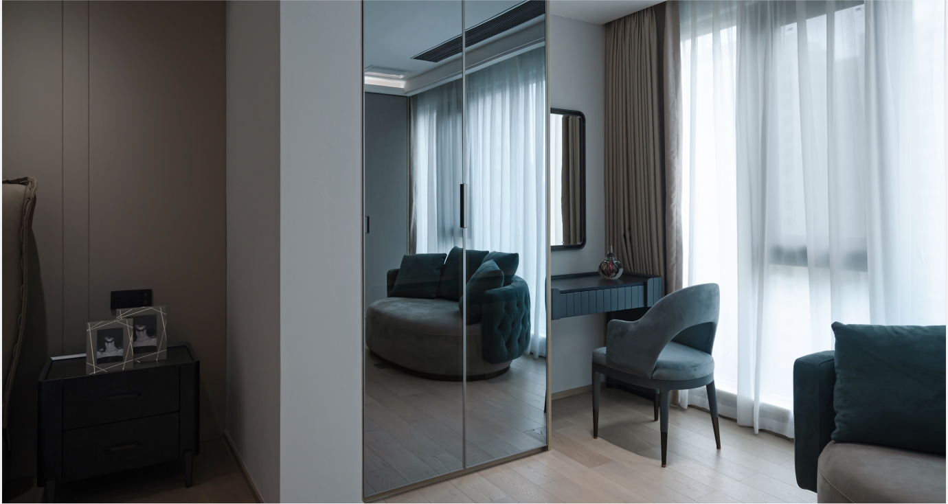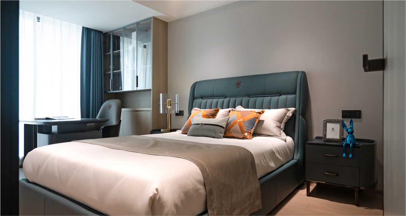 The children’s bedroom continues the overall space’s clean and elegant style, with a bright and open feel. Clever use of both cool and warm colors, balanced in just the right proportions, creates a harmonious environment. Playful, cartoonish decor adds a touch of whimsy, returning to a sense of innocent charm and subtly conveying the warmth and comfort of home.