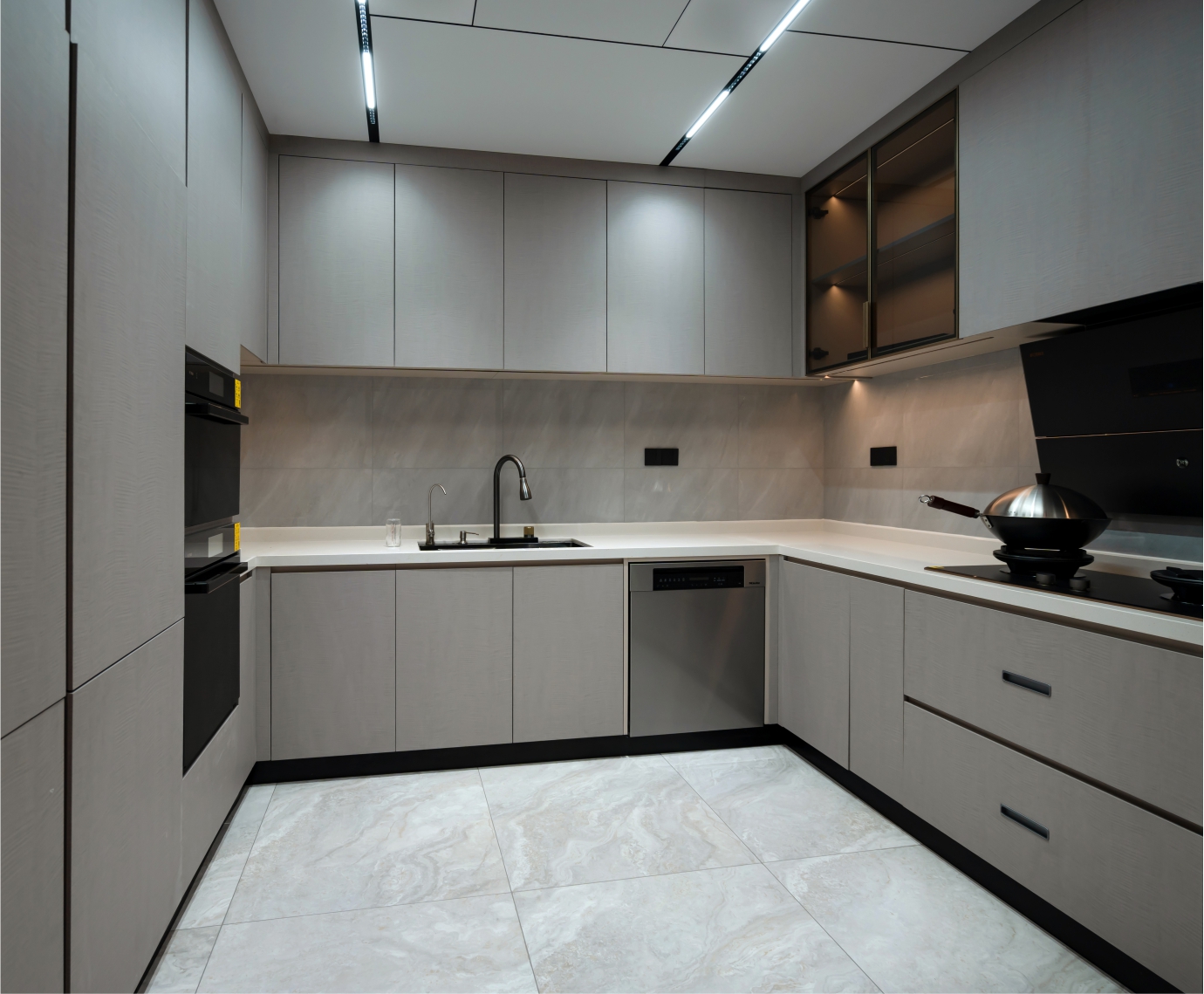 The true essence of life emerges in every meal. Looking from the living room, the kitchen is located in a separate space on the other side, effectively containing cooking fumes and subtly expressing care. Within this orderly layout, the warmth of home gradually intensifies. Aesthetic in its simplicity, the kitchen embodies the light of everyday living, balancing the scale of life with a sense of joy and harmony.