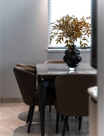 The core of the dining room is to express an inherent atmosphere, with design serving as a precise representation of lifestyle. The designer consistently integrates lifestyle aesthetics into every detail of the home, and this fusion breathes life into the space, creating the simplest and most comfortable living scene. The boundary between the living room and dining room is limitless, with multiple intersections closely weaving function and aesthetics together. Uninterrupted light pours in, creating a natural and expressive tone, making the space interesting and light. The luxurious texture of the coffee-colored dining chairs, combined with the natural transparency of the marble, creates a visual feast of artistic elegance.