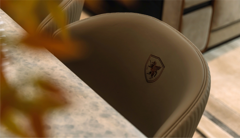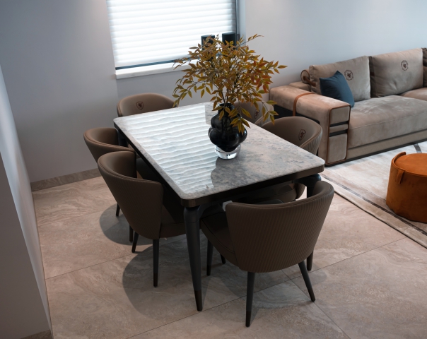 In the details, the designer uses top-grain leather to cover the chairs, with the hardness of the stone contrasting beautifully with the softness of the forms, creating a paradoxical beauty. The texture of the natural stone dining table echoes the color and form of the dining chairs, presenting a serene and natural atmosphere within the home.